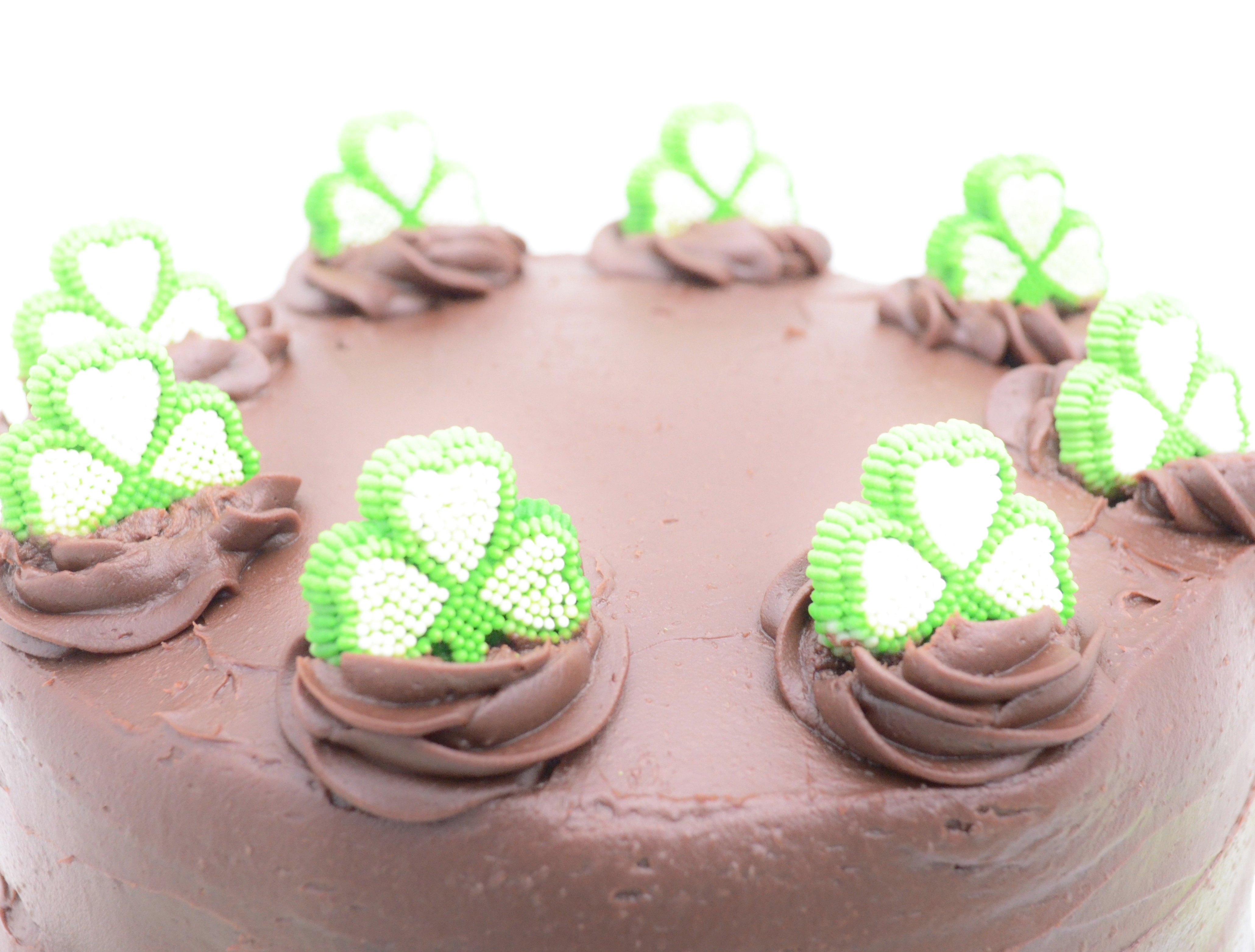 - Once the layers have cooled, use an offset spatula to spread a thick layer of chocolate frosting on the first layer before topping it with another layer. Repeat with the rest of the layers, making sure to alternate the lighter and darker green layers as you frost the cake and build it up. Once all the layers have been assembled, spread an even layer of frosting across the top and sides of the cake. With the remaining frosting, fill a pastry bag fitted with a large star tip. Pipe 8 rosettes around the top edges of the cake. Place a shamrock decoration on top of each rosette.