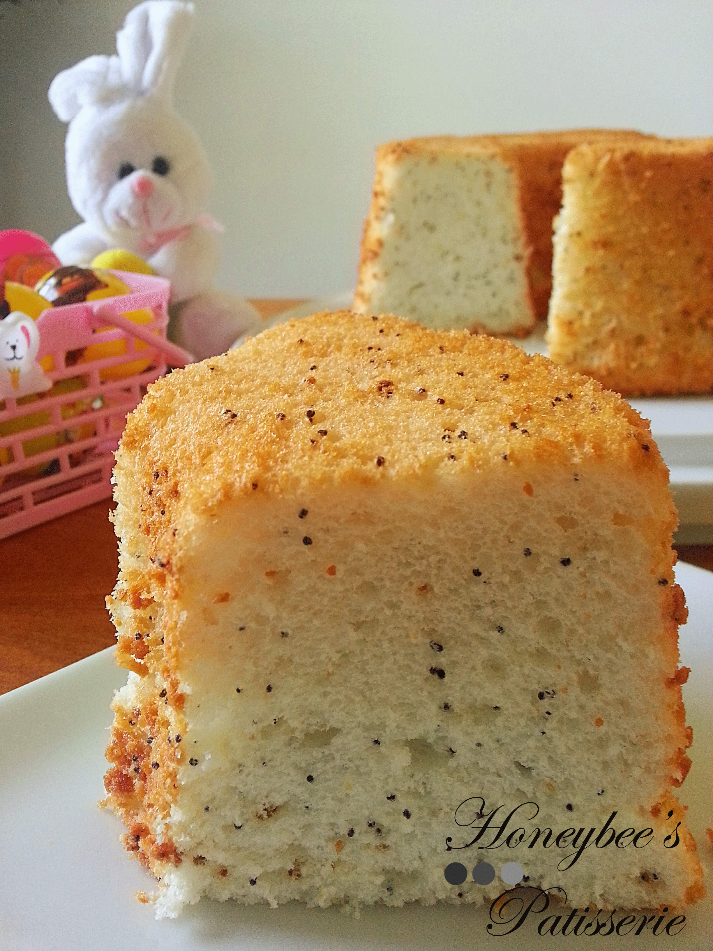 - Sift the flour mixture over the whipped egg whites in 3 separate additions. Fold the mixture gently with a rubber spatula after each addition until incorporated. Gently stir in the poppy seeds until evenly distributed. Scrape cake batter into a 12-cup UNGREASED tube pan.