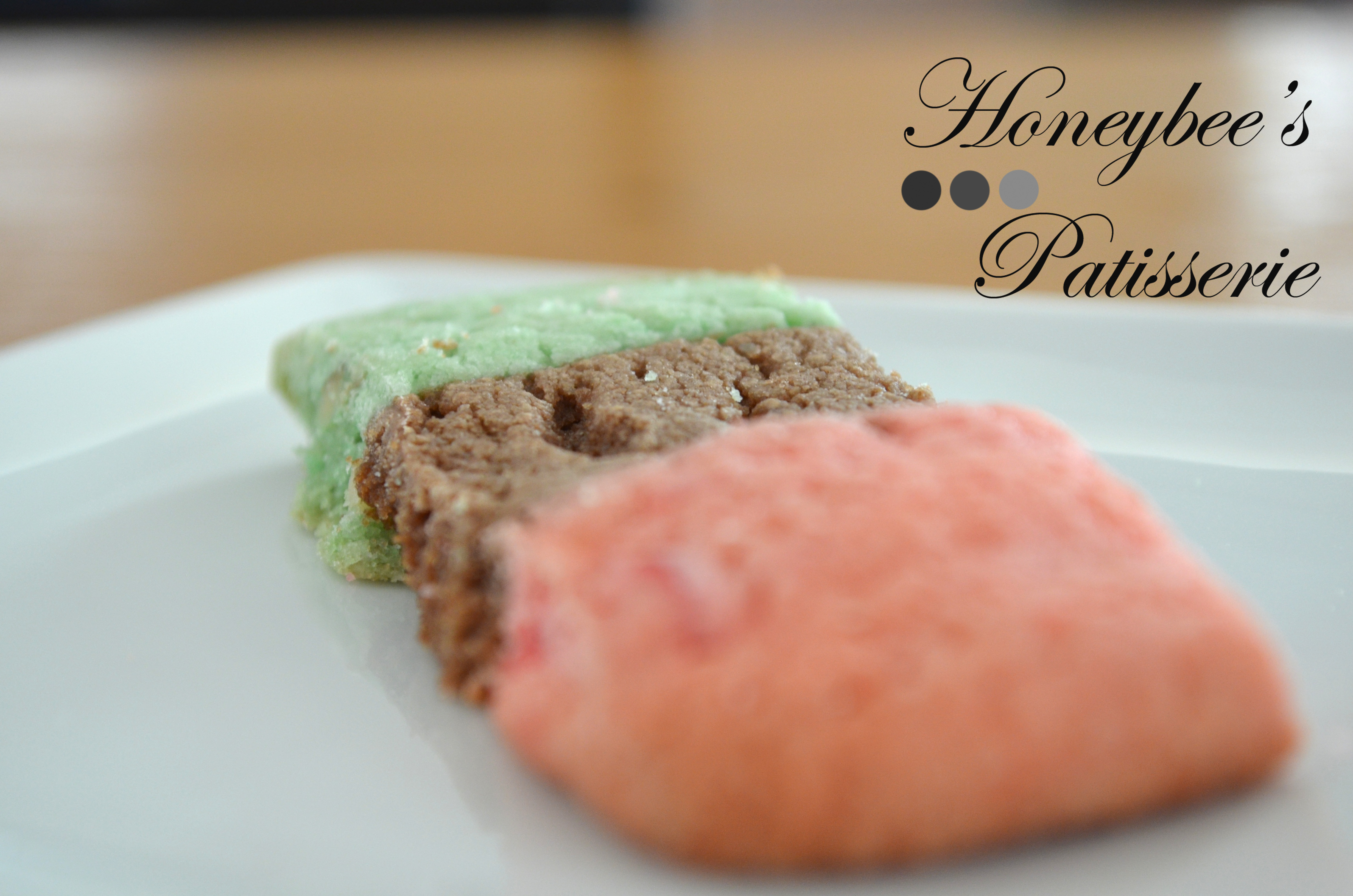 Note: These cookies use three separate doughs merged into one to make the tri-colored appearance. I roll the dough into ropes, place them alongside each other, and roll flat with a rolling pin to merge the dough. You can also roll out each dough ball into equal length and thickness then stack the dough on top of each other and slice with a sharp knife to get a similar effect. Whichever method you choose, be sure to chill the dough slightly to make it easier to get uniform cookies. This recipe produces approximately 3 dozen cookies.