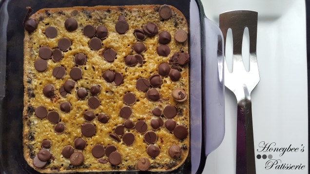 - Meanwhile, in the bowl of a stand mixer (or in a medium bowl with a hand mixer), beat eggs, peanut butter, vanilla, salt, and remaining 5 tbsp. sugar on medium-high, until fluffy and doubled in volume, about 2 to 3 minutes. Beat in shredded coconut. Spread mixture over cooked crust. Bake for 8 minutes. Remove pan from oven and top with chocolate chips. Bake an additional 3 to 5 minutes more, or until filling has set.