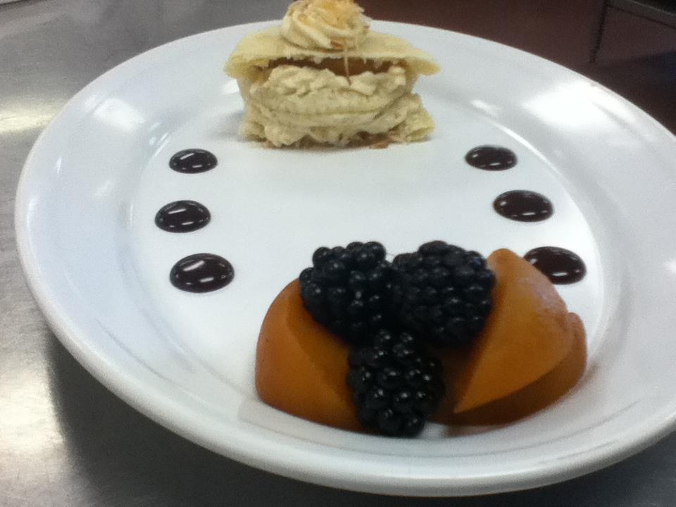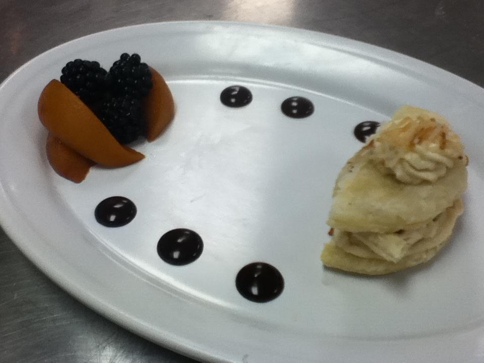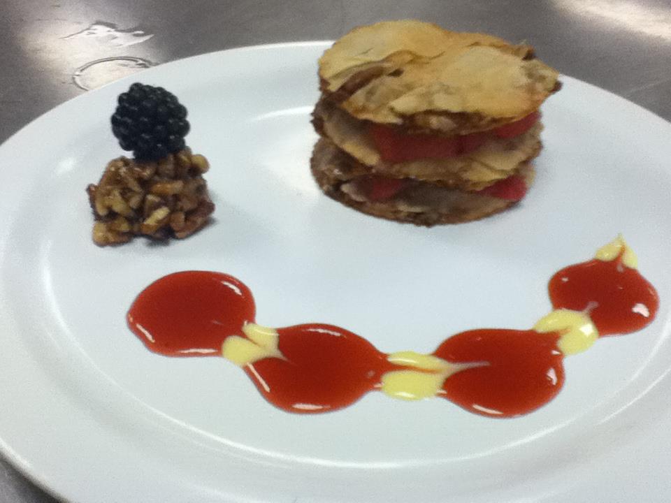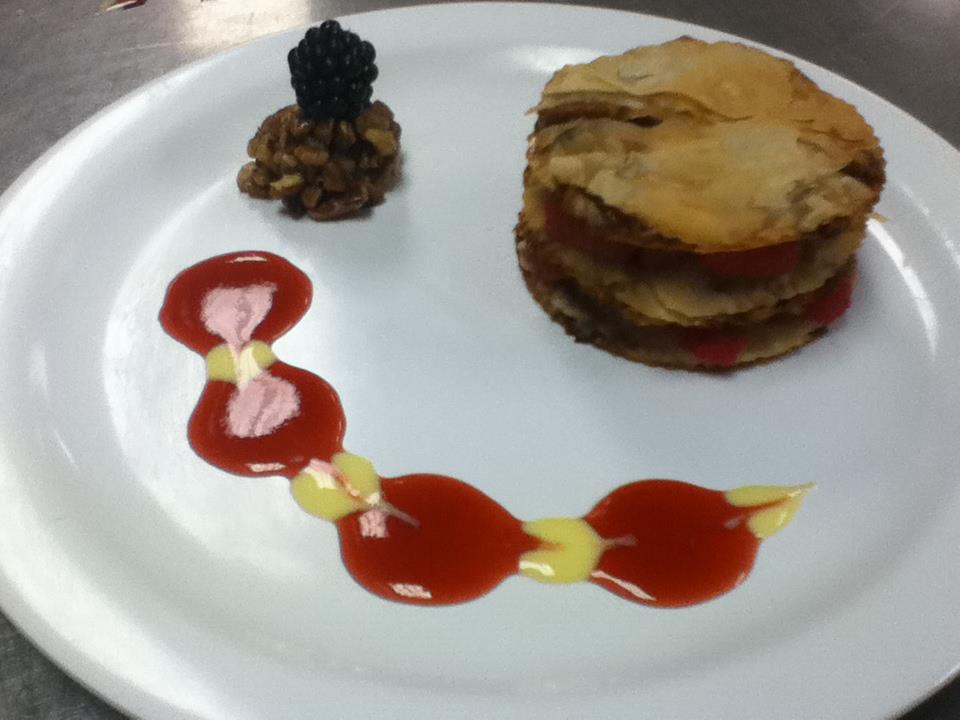 With the napoleon constructed it was on to decorative sauce creation and adornments for the presentation. To compliment the raspberries I added to the napoleon, I created a Strawberry Rhubarb Rum Coulis. I placed four rounds on the plate all leading the eye toward the napolean. To add contrast to the red colored coulis and compliment the pumpkin spice pastry cream filling, I created a Maple Nut Creme Anglaise. I placed four rounds between the Coulis and drew a bamboo skewer through both sauces to add a finishing look to the plate. For the final adornment, I simply utilized leftover praline to prevent further waste. I shaped the praline mixture into a mound and topped it with a fresh blackberry. This added height, color contrast and it complimented flavors within the dish, which is of course important.