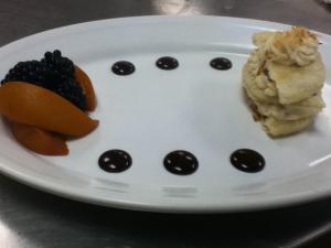As for the decorative elements to this plate, I made sure to incorporate sauce and fresh fruit for added textures, tastes, and colors. As mentioned previously, I created Spicy Poached Peaches not only for the napoleon but also decor. I poached the peaches in red wine with whole allspice, black peppercorns, and a cinnamon stick until tender. For plating I aligned three peaches to create an abstract basket to hold the fresh blackberries. This created additional color, shape and complimentary flavors for the rest of the plate. This all leads to the final element on the plate, the sauce. The sauce I chose to create was chocolate. This added a distinct color which popped off the white plate and also added contrast to the other colors. To make the chocolate flavor meld with the rest of the plate, I enhanced it with Tangelo and Orange Blossom extracts made by Amoretti. These are wonderful jewels to have in any pastry kitchen as they give great options for creating epic flavor profiles in any dish, whether culinary or pastisserie. I placed the chocolate sauce in three simple dots on each side to draw the eye back and forth between the bushel of peach and berries to the napoleon.